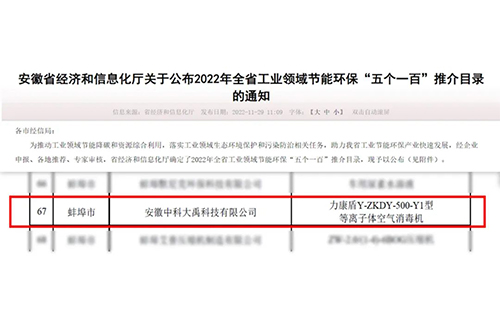 入選2023年全省工業(yè)領(lǐng)域節(jié)能環(huán)?!拔鍌€(gè)一百”推介目錄(節(jié)能環(huán)保新產(chǎn)品新裝備:G-ZKDY-2500-Y1型等離子體空氣消毒機(jī))